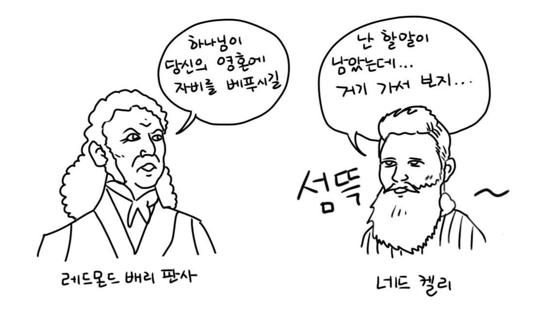 섬뜩한 사실은 네드가 11월 11일에 멜버른 감옥에서 교수형을 당하고 12일 후, 배리 판사도 생을 마감한다. (1880년 11월 23일) 네드가 그를 저승 길동무로 데리고 간 건 아닐까?