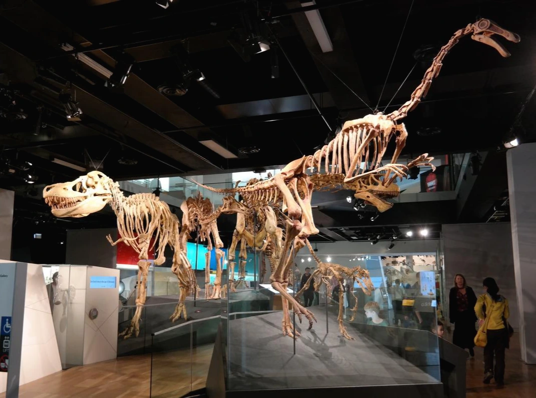 잠시나마 옛 추억을 소환하고 나서 전시장 안을 살피기 시작했다. 가장 먼저 도착한 공룡 전시장은 박진감 넘쳤다. 마치 거대 공룡들이 행진을 하고 있는 것 같이 연출하였는데, 그중에서도 압권은 선두에 서서 2층에 기어오르는 마멘치 사우르스(Mamenchisaurus) 화석이었다. 이 화석은 1층과 2층에서 나누어 봐야만 전체를 볼 수 있을 정도로 거대했다.