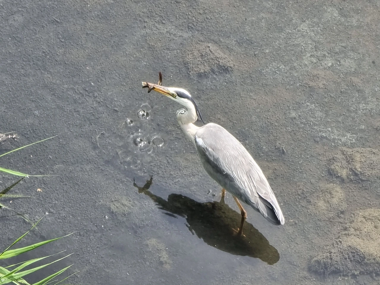 그런데 신기하게도 나의 출퇴근 길에 왜가리가 다시 출몰하기 시작했다. 그것도 다리 바로 아래에 사냥 포인트를 정해 놓고 종종 미꾸라지를 잡아먹는다. 지난 주말에는 딸아이와 키즈 카페를 갈 때 그리고 올 때 두 번에 걸쳐 사냥 쇼(?)를 선보였다. 길동무와 그의 딸을 위해 미리 준비한 것처럼...
