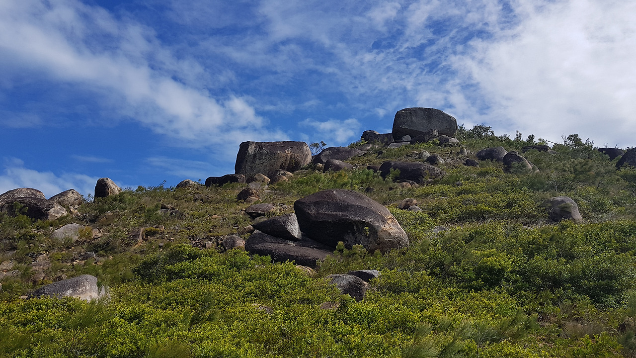 긴장된 마음으로 등산로 입구에 이르자 황볏 앵무새(Sulphur crested white cockatoo) 무리가 나를 반겨 주었다. 볏을 세우고 소리를 내며 반갑게 맞아 주는 모습에 힘이 솟았다. (나중에 알고 보니 위협을 느꼈을 때 경계하는 모습이었다.) 타이머를 누르고 산을 오르기 시작했다. 경사가 완만한 숲 길을 지나 오르막 길에 들어서자 특이한 형태의 암석들이 즐비하게 놓여 있었다. 탑 모양 암석, 사과를 반으로 쪼갠 듯한 모양의 암석 등 마치 등산로에 누군가가 조각을 해 놓은 것 같았다.