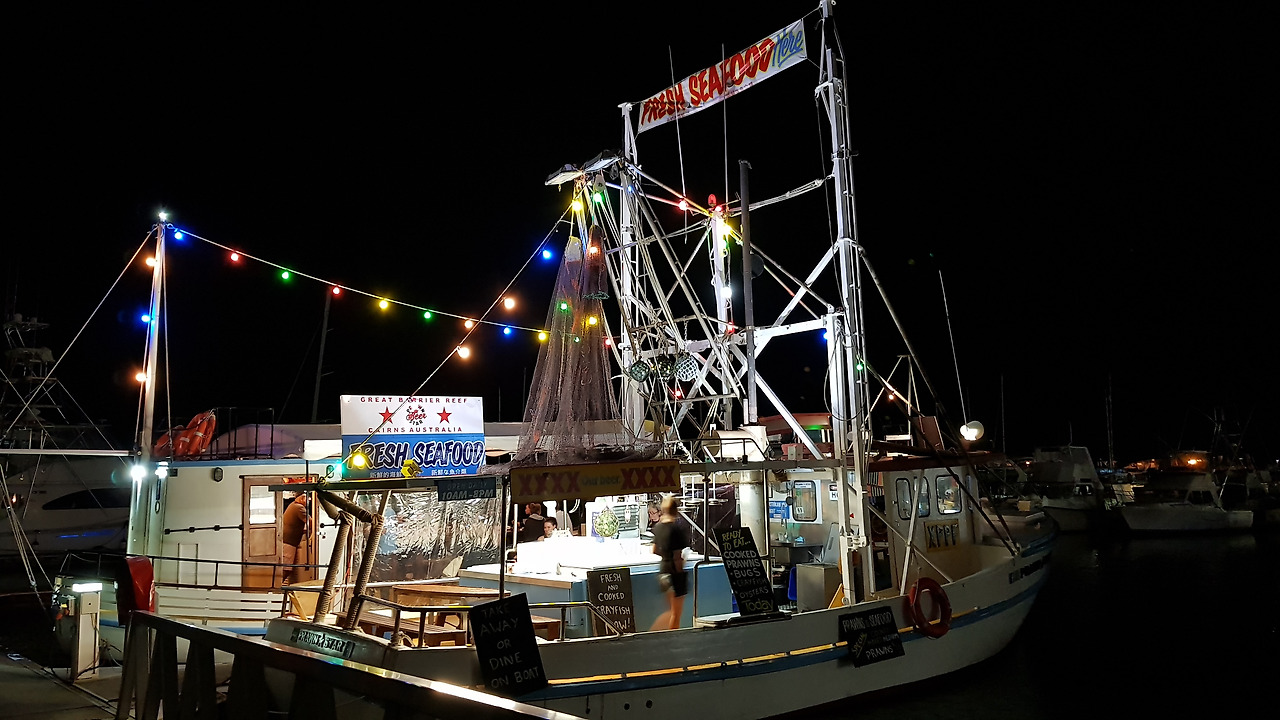 선상 포장마차는 어제 들렀던 라군에서 도보로 5분 거리에 있었다. 상호는 ‘프라운 스타’(Prawn Star)였다. 저녁 6시를 조금 넘긴 시간이었는데 사람들이 줄을 서서 기다리고 있었다. 프라운 스타는 선창에 두 대의 요트를 정박해 놓고 그 위에서 술과 해산물(튀김과 찜)을 파는 선상 식당이었다. 기다리는 동안 메뉴를 보고 주문할 요리를 정했다. 메뉴에는 고가의 크레이 피시(Crayfish), 머드크랩(Mud Crab)은 물론 상대적으로 저렴한 타이거 새우(Tiger Shrimp) 등이 있었다.