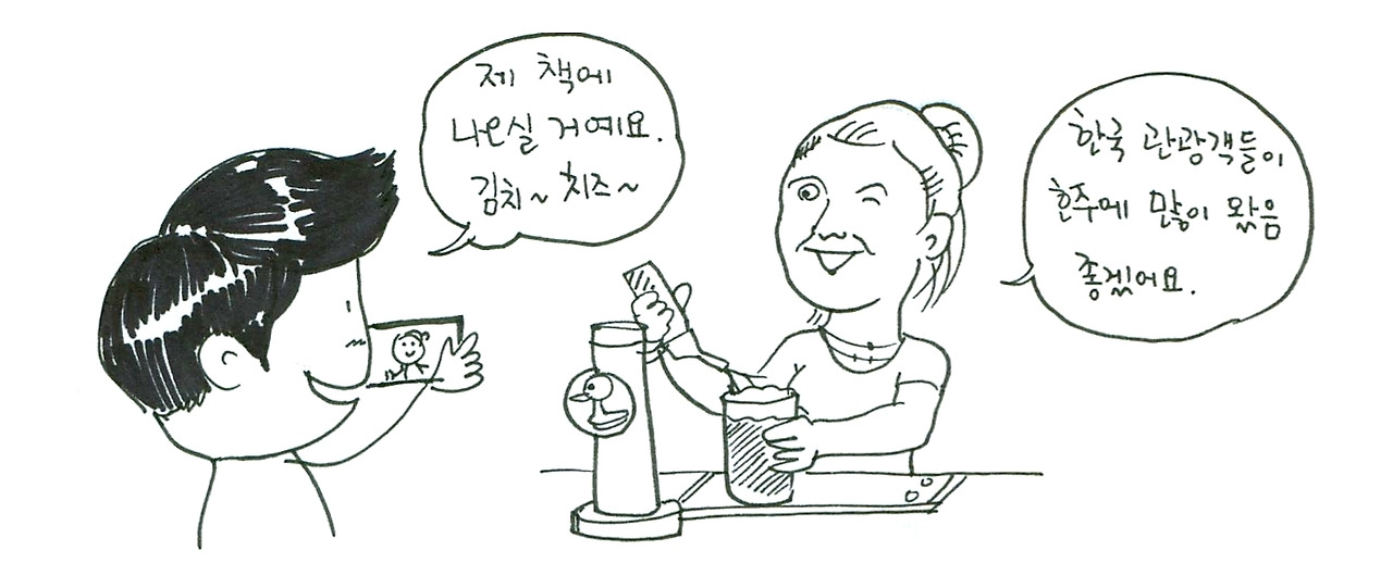 주인아주머니가 추천해 준 탄산 커피를 주문했다. 능숙한 손놀림으로 커피를 받고 있는 아주머니께 “한국에서 온 여행작가인데 여행 책자에 소개해도 괜찮겠냐고?” 묻자 흔쾌히 탄산 커피가 나오는 탭을 잡고 포즈를 취해 주셨다.
