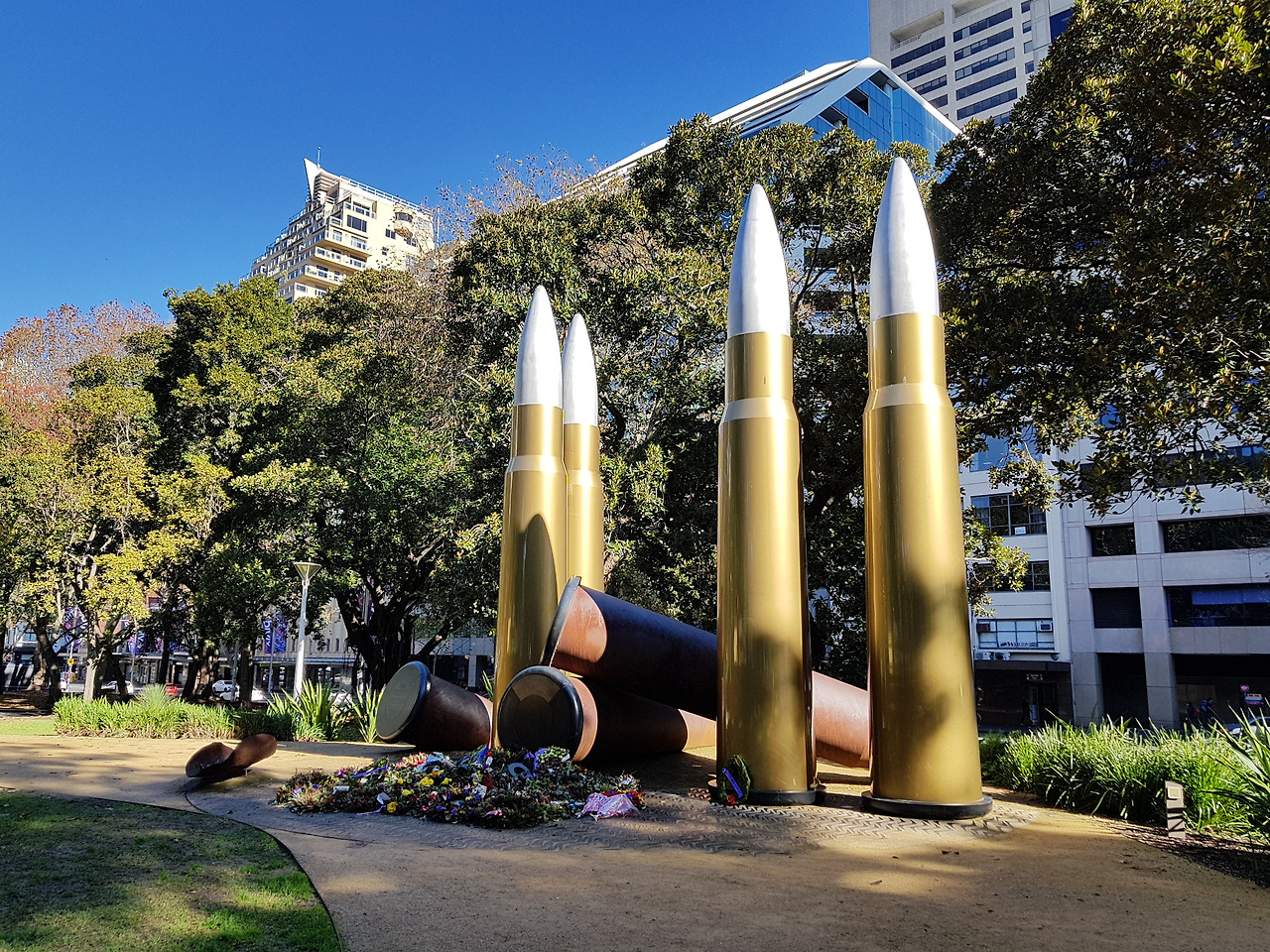 추모관 공원에는 대형 탄환 조각이 전쟁의 폐해를 방문객들에게 전하고 있다.