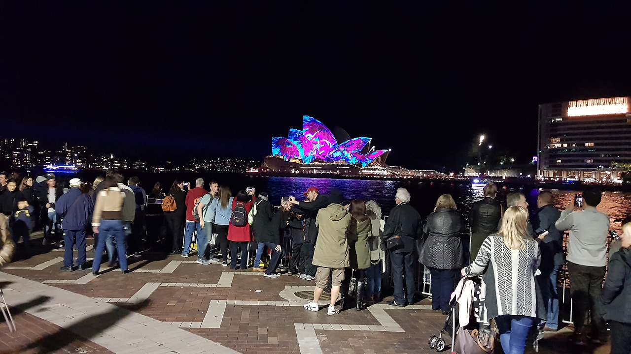 수많은 사람들이 시드니 항 난간에 기대 비비드 축제의 메인 퍼포먼스인 오페라 하우스 파사드 쇼를 기다리고 있었다. 어느 정도 시간이 흘렀을까, 웅장한 음악과 함께 오페라 하우스는 다채로운 색으로 물들기 시작했다. 때로는 살아 있는 생물처럼 때로는 아름다운 건축물처럼 변화무쌍하게 변하는 오페라 하우스의 모습이 인상적이었다. 관람객들은 아름다운 순간을 포착하기 위해 사진과 영상을 쉴 새 없이 촬영했다. 오페라 하우스 메인 공연은 축제 기간 중 하루에 6번(저녁 6시~밤 11시 정각) 진행되고 있었다.
