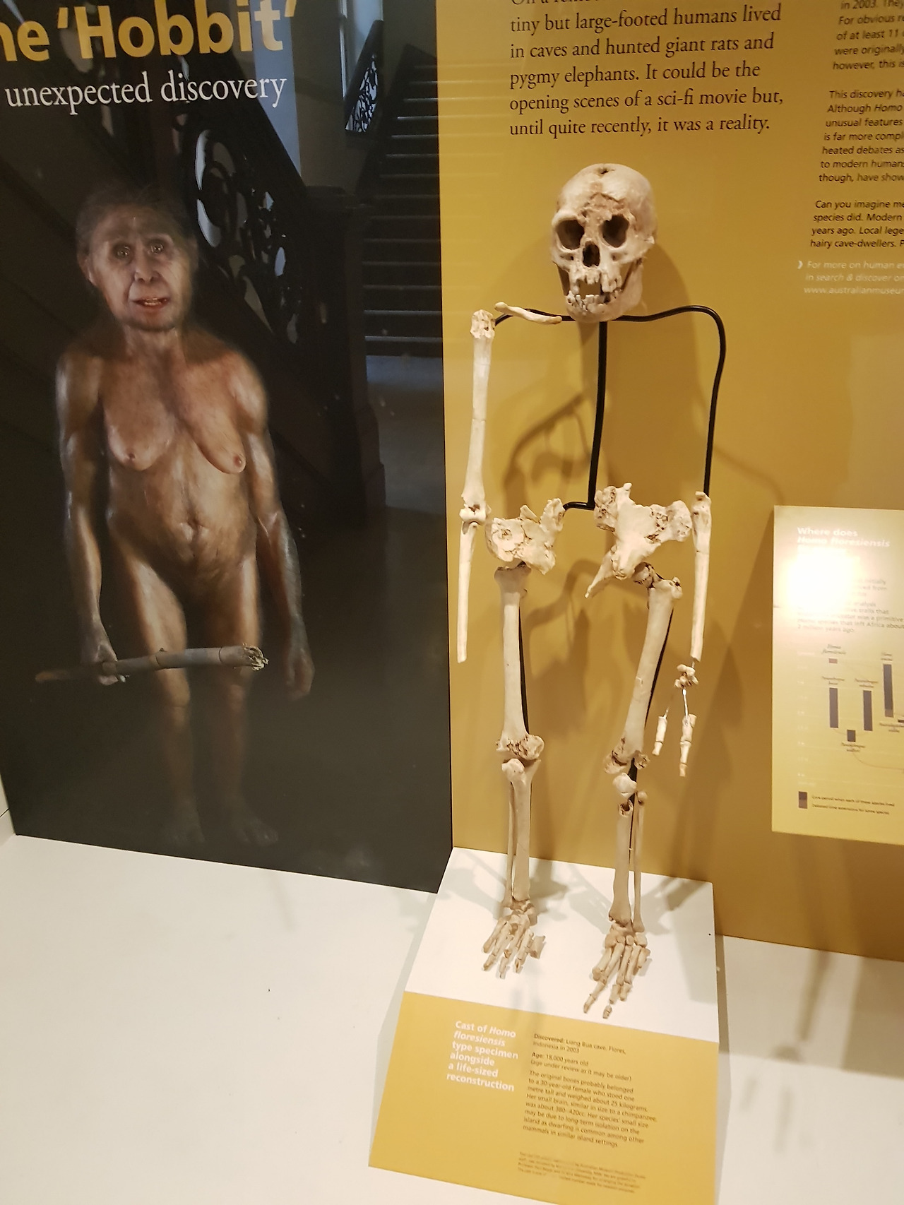 고생물 전시관을 나오는 길에 흥미로운 전시물을 발견했다. 그것은 바로 ‘호빗’을 연상하게 하는 소인족의 유골이었다. 약 6만 년 전, 인도네시아 부근에 살았다는 호모 플로레시엔시스(Homo Floresiensis)의 유골 화석은 2003년 호주, 인도네시아 공동 발굴팀에 의해 인도네시아 플로레스섬 리앙 부아 동굴에서 발견되었다고 한다. 신장은 1m 남짓으로 우리가 영화에서 보았던 ‘호빗’이 실제로 존재했음을 알 수 있다. 호모 플로레시엔시스는 현생 인류와는 다른 종으로 약 1만 3년 전에 멸종했다.