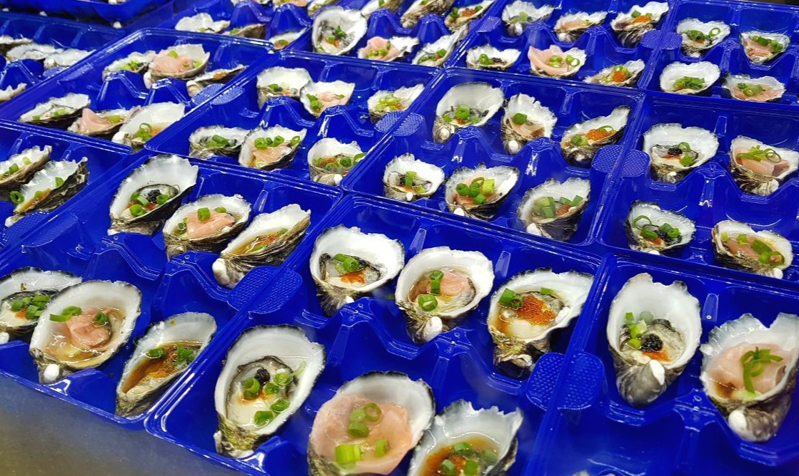 나의 경우 초밥 코너에서 도넛형 초밥(원형 도넛 모양 밥 위에 생선회와 소스, 날치 알이 뿌려진 형태)과 6개로 구성된 석화 세트(석화에 다양한 양념을 뿌린 형태)를 구입했다. 여기에 화이트 와인을 곁들여 피시 마트 옆 실외 벤치에서 식사를 했다.