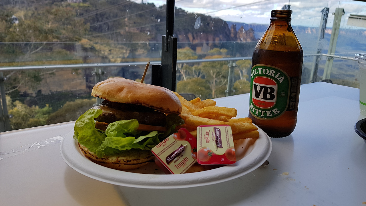 시닉 워크 웨이를 돌아보고 협곡의 정상으로 돌아와 점심 식사를 했다. 식당은 세 자매 바위를 바로 조망할 수 있는 자리에 위치하고 있었다. 앵거스 햄버거에 호주의 대표 맥주인 빅토리아 비터(Victoria Bitter)를 곁들여 식사를 했다.