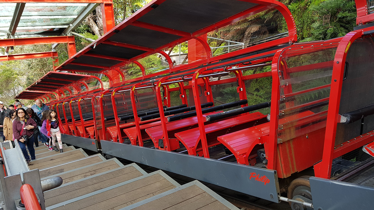 협곡 아래 산책로(Scenic Walkway)가 위치한 자미슨 계곡(Jamison Valley)으로 가는 두 가지 방법이 있다. 한 가지는 케이블 카(Scenic Cableway)를 타는 것, 또 하나는 기차(Scenic Railway)를 타는 것이다. 케이블 카를 타면 230m에 달하는 카툼바 폭포(Katoomba Falls)를 한눈에 감상할 수 있고, 가차를 타면 급경사로를 내달리는 스릴을 만끽할 수 있다. 참고로 속도가 빨라지면 배경음악도 템포가 빨라져 긴장감을 더한다. (개인적으로 기차가 마음에 들어 2번 왕복했다.)