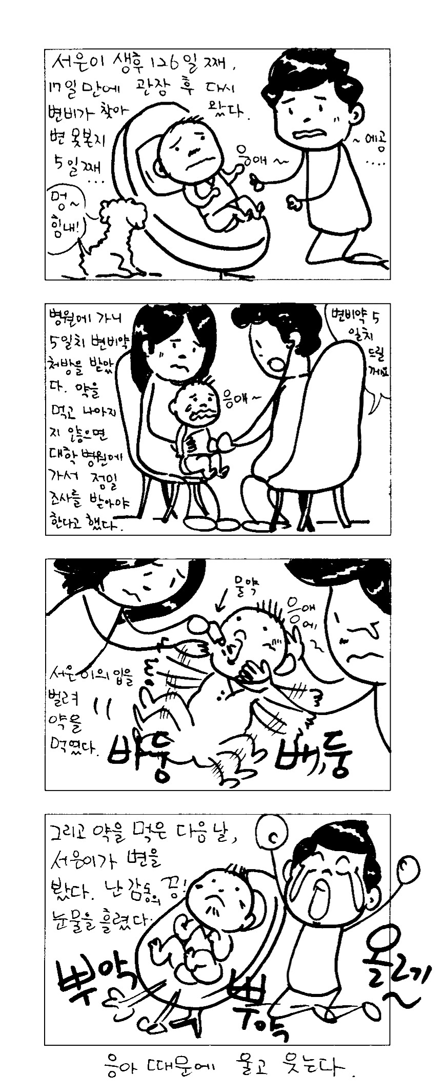 2년 전 그린 육아만화를 브런치에 올리다 보니 세상이가 변비로 고생이 많았던 순간들이 떠오른다. 지금은 와이프의 노력으로 '쾌변'의 아이콘이 되었지만...