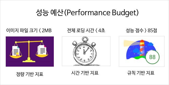 성능 예산이란 웹 성능에 영향을 미치는 다양한 요소를 제어하는 한계값을 의미합니다. 웹 페이지의 크기, 로딩하는데 걸리는 시간, 페이지에 포함된 이미지 파일의 수 등 다양한 값들이 존재합니다.