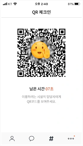 카카오톡에서 QR 체크인을 하기 위한 방법은 카카오톡 실행 후 하단의 #탭(세 번째 탭)에서 맨 앞의 ‘코로나19’ 특별페이지에 위치한 QR 체크인 버튼을 선택하면 됩니다. 이후 개인 정보 동의를 거치면 QR코드가 생성됩니다. 최초 이용 시 전화번호 확인 인증이 필요하며 전화번호 확인 인증은 한 달간 유효합니다.