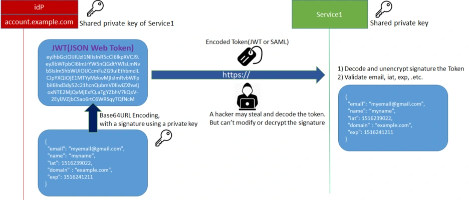 ① 인증 서버(idP)와 각 Service 서버들은 사전에 비밀키(private key)를 공유한다.