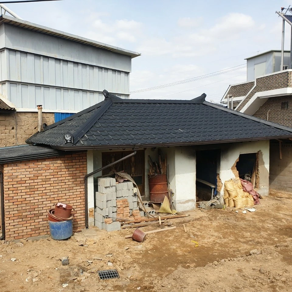 내부를 보았을 때 천정에 물 하나 새는 것이 없어서 처음에 공사비를 아끼고자 고민했던 것이 자연에 풍화된 시멘트 기왓장을 그대로 살리고자 생각했습니다. 그 방법 중 하나가 에어건으로 먼지와 이끼를 털어내고 방수액을 도포하고 난 뒤에 프라이머를 발라 비가 올 때 물이 도르르 떨어지는 에나멜수지로 만든 페인트를 칠하는 것을 생각하였고 본채가 빨간 지붕이다 보니 별채는 노란색이나 초록색으로 페인트를 칠하고 싶었습니다.