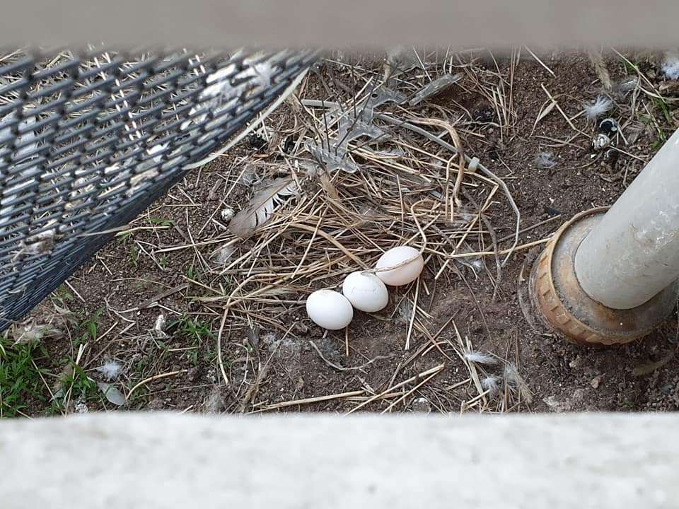 바로 비둘기 알 두 개였다(사진의 세 개는 나중에 찍은 것). 문을 벌컥 여는 인간을 보고도 도망가지 않은 이유는 바로 이 알을 지키기 위한 것이었다. 그러자 양심의 깊은 구석을 찌르는 느낌이 들며, 출근하는 내내 마음이 무거웠다.