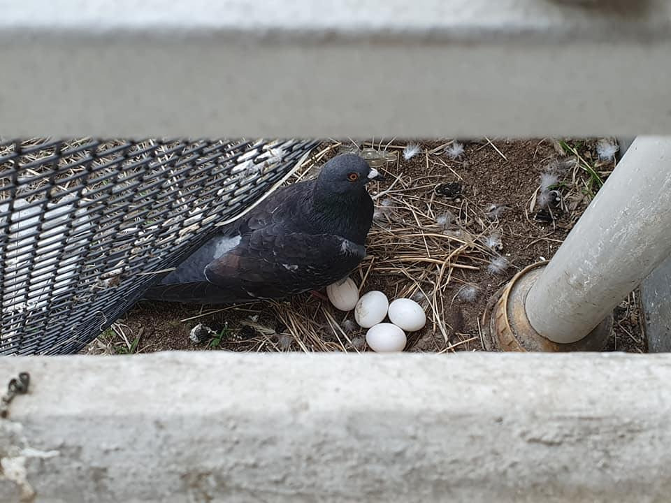 그다음 날 퇴근 후, 젠장 알이 하나 더 늘어있었다. 심지어 이 비둘기는 알을 발견한 이후로 밥도 안 먹고 사는지 그 자세 그대로 알을 품고 있었다. 밤에 살짝 보니 머리를 오른쪽 날개에 묻고 자고 있었다. 마음은 더욱 불편해지는 상황.