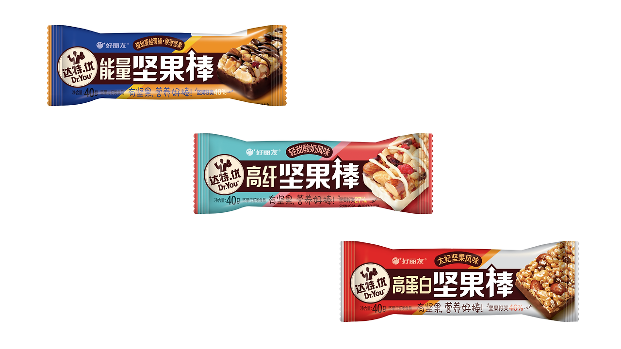 오리온의 접근은 조금 다릅니다. 별도 브랜드 네임을 개발하기보다 母브랜드를 앞세웁니다. 기본 형태는 오리온 견과바(好丽友 坚果棒)입니다. 견과바(坚果棒)는 일반명사입니다. 오리온은 '견과바' 앞에 에너지(能量), 식이섬유(高纤), 고단백(高蛋白)의 이름을 붙입니다. 모두 일반명사죠. 고유의 브랜드명이 아니기에 이름에 대한 권리를 소유할 수는 없지만 소비자에겐 직관적입니다. 오리온에서 만든 견과바 제품임을 쉽게 알 수 있습니다.
