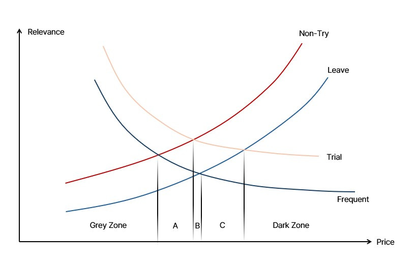 C Zone은 매출 하락의 구역입니다. 신규 고객의 Trial은 적고, 기존 고객의 이탈도 많아집니다. 더 높은 가격대의 Dark Zone은 말 그래도 암흑의 지역, 정해서는 안 되는 가격대입니다.
