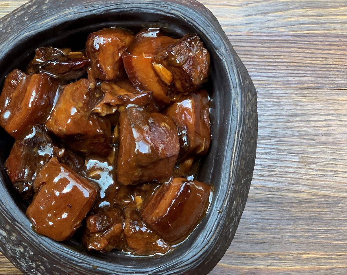 큼직하게 썰은 삼겹살을 약한 불에 졸이고 천천히 볶아 조리한다. 간장과 설탕의 색이 더해진 고기의 붉은색은 오히려 맑다. 조리용 술과 마늘, 생강 등의 재료가 더해진다.