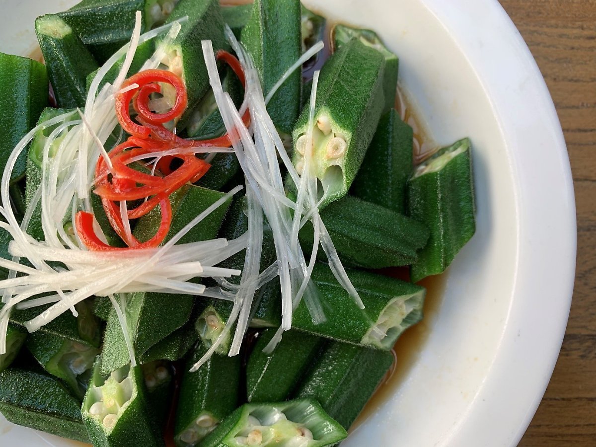 데친 오크라에 간장을 베이스로 한 양념을 살짝 얹었다. 싱거운 듯 간을 맞춰 짜지 않다. 양념도 재료를 앞서지 않는다. 요리의 주인은 당당히 오크라다.