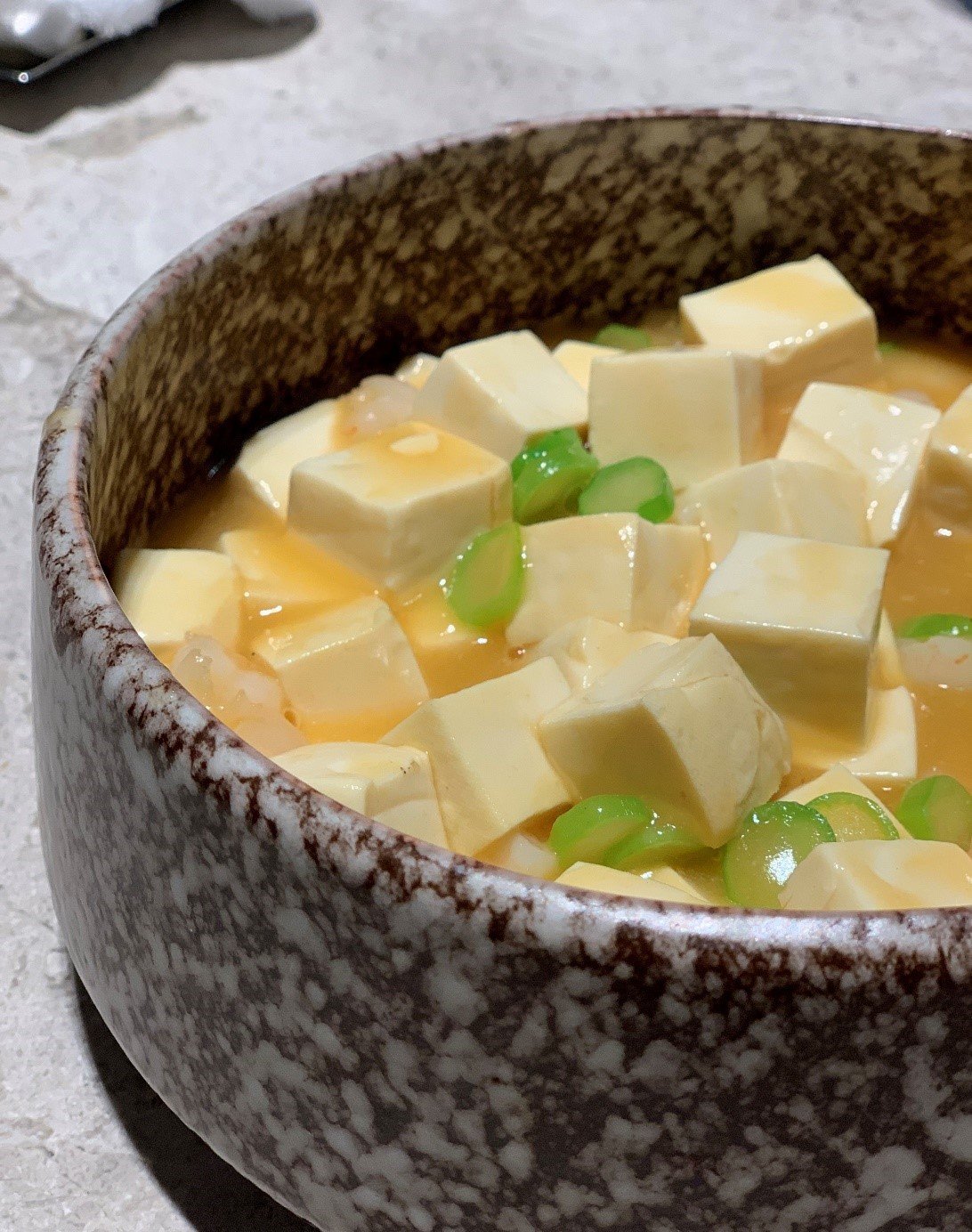 바닥을 덮은 걸죽한 국물에 두부가 담겼다. 두부의 모양새와 질감은 대동소이하고, 그 외의 것은 모두 상반된다. 돼지고기가 아닌 새우, 가리비 등의 해산물을, 두반장과 마라(麻辣)가 아닌 계란과 육수로 소스의 맛을 냄이 다르다.