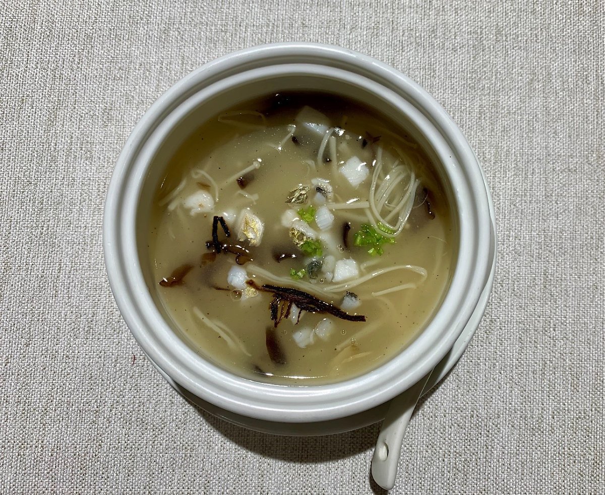귀한 약재 천피를 넣어 끓여낸 위껑이니, 보양식이다. 일견 목이버섯처럼 보이는 검붉은 재료는 오독하게 씹히나 질기지 않다. 약향은 국물에 풀어져 강하지 않으나, 내재한 귤의 맛과 향이 묵직하게 올라온다. 쉬이 풀어지는 황위의 살과 대비되는 식감이고, 다소 진득한 국물의 무게를 덜어주는 향이다. 그 맛도 단일하지 않아, 새콤하며, 쓰고, 단 맛도 미묘하게 섞여 어우러졌다. 약재라 하기엔 무겁지 않고, 가볍게 흩어지지 않는 맛에 음식은 귀해졌다.