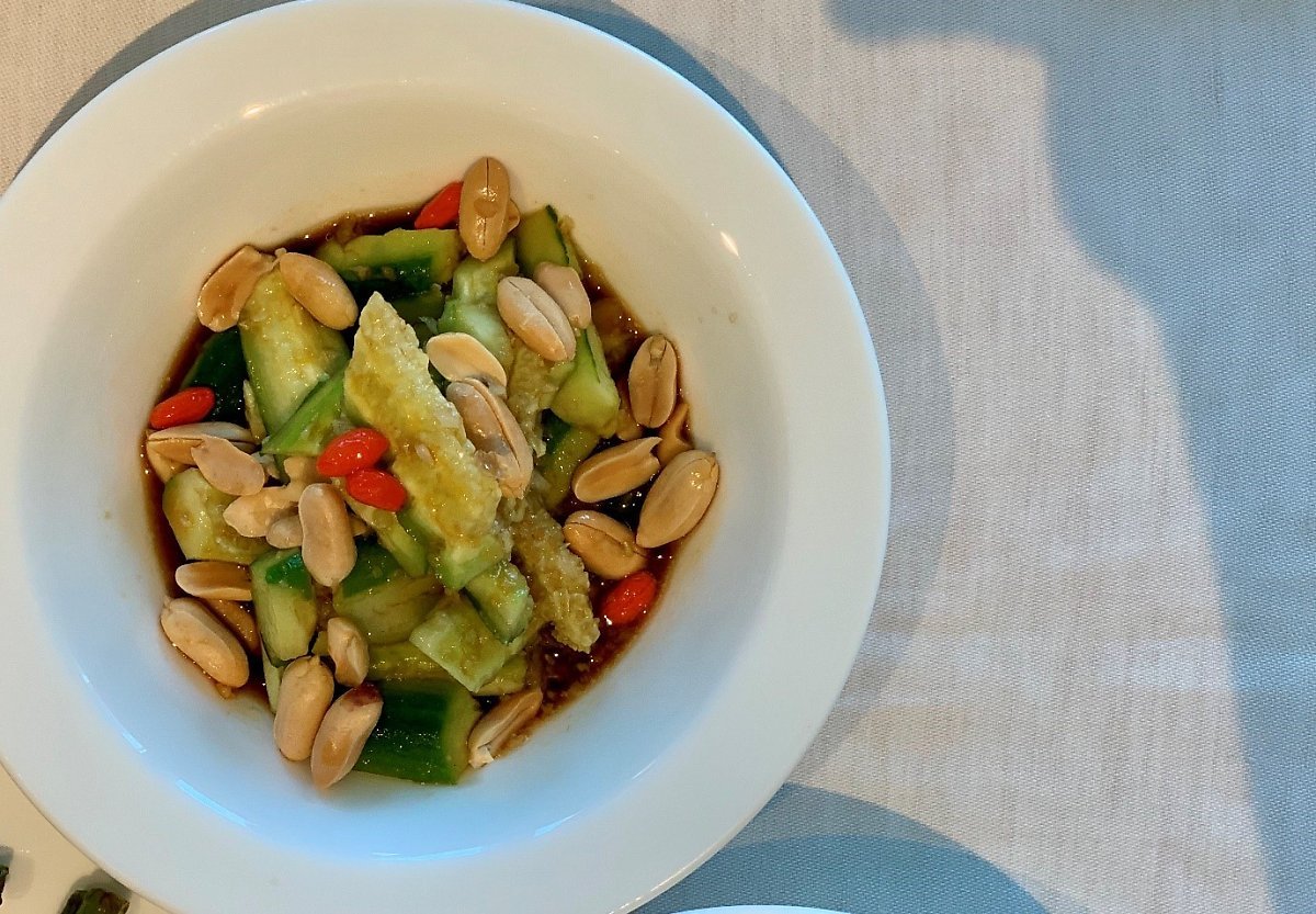 뜨거운 요리(热菜) 중 차가운 량차이(凉菜)로, 기름진 요리 속 개운하고 상큼한 맛으로, 부드럽고 질긴 식감 속 아삭함으로. 파이황과(拍黄瓜)는 그 소박한 재료로 사막 속 오아시스와 같아, 잠시 쉬어간다.