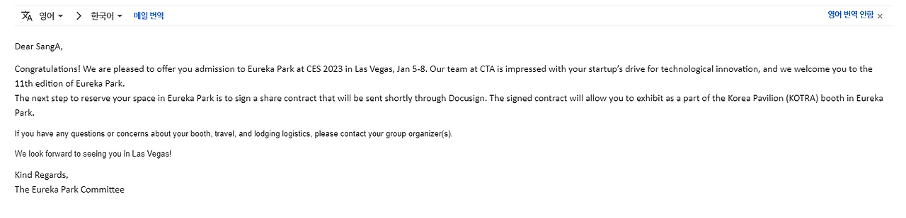 CES는 CTA가 주관사이기 때문에 지원사업이 되더라도 CTA 승인을 받아야 참가할 수 있다. 한국의 지원사업 심사가 보통 먼저 끝나기 때문에 지원사업을 합격하게 된다면 그 다음에 기관 안내에 따라서 CTA 승인을 받기 위한 신청을 하고 보통 2~5주 안에 회신이 오게 된다. 보통 2~3주 안에 온다고 했었는데 참고로 5주 만에 올 수도 있다는 것을 알았다!