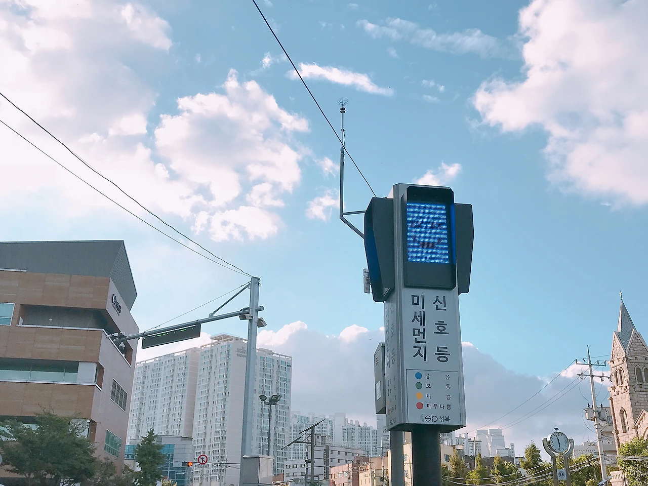 성북구청 앞 미세먼지 신호등은 대부분 미세먼지 농도 '보통'에 해당하는 녹색 표시가 떠 있다. 미세먼지 신호등이 '좋음'에 해당하는 색깔과 표정으로 웃는 걸 처음 봤다. 하늘이 웃고 있는데 내 마음은 왜 이런담.