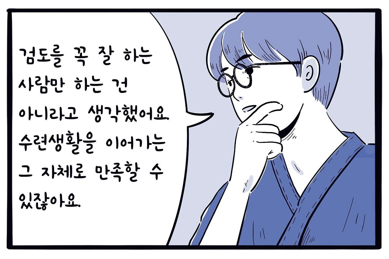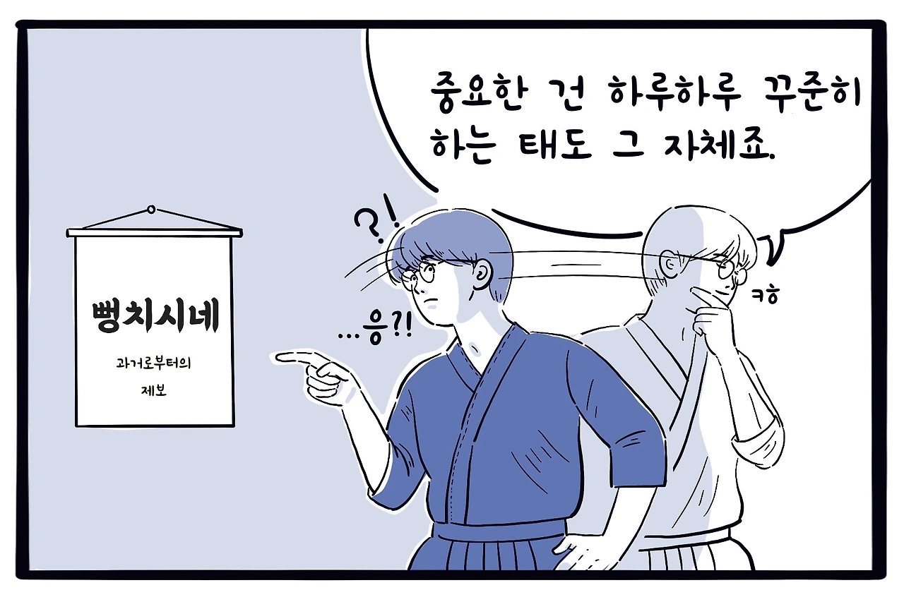 오래 검도를 해도 시합에서 1회전 탈락을 도맡아 하던 나. 관절이 녹슨 깡통로봇처럼 뻣뻣하게 움직이던 나. 특히 학습이 더딘 나로써는 ‘못하는 게 고정값’이었다. 이 친구는 혹시 학창시절부터 모범생이어서 ‘잘 해내는 게' 중요한 걸까. 잘 못해도 매일 수련을 한다는 사실이 중요한걸. 이런 (꼰대같은) 생각을 가장 오랜 검도친구인 애인에게 말했다. 대답이 뜻밖이었다. “너도 똑같은 이유로 검도 그만두고 싶다 말한 적 있거든?!”