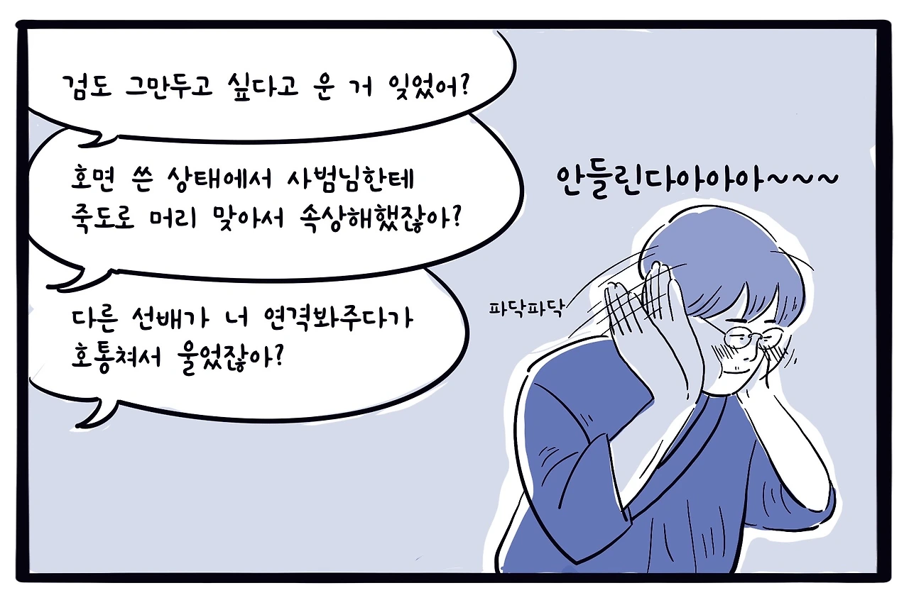 수련 도중 관장님의 지적을 제대로 반영하지 못했을 때 호면을 쓴 상태로 죽도로 머리를 맞기도 했다. 자세를 교정해주던 중년의 남자선배는 바로 해내지 못하는 내가 답답했던지 호통을 쳤다. 호면을 썼으니 누가 얼굴 못 보겠지. 눈물이 울컥 차올라서는 장비를 안 벗고 도장 한켠에 앉아 조용히 울곤 했다. 나는 왜 이렇게까지 하고 있을까. 그만해야 하는 게 아닐까. 땀에 절은 채 샤워실로 향하며 그런 생각을 했던 것 같다.