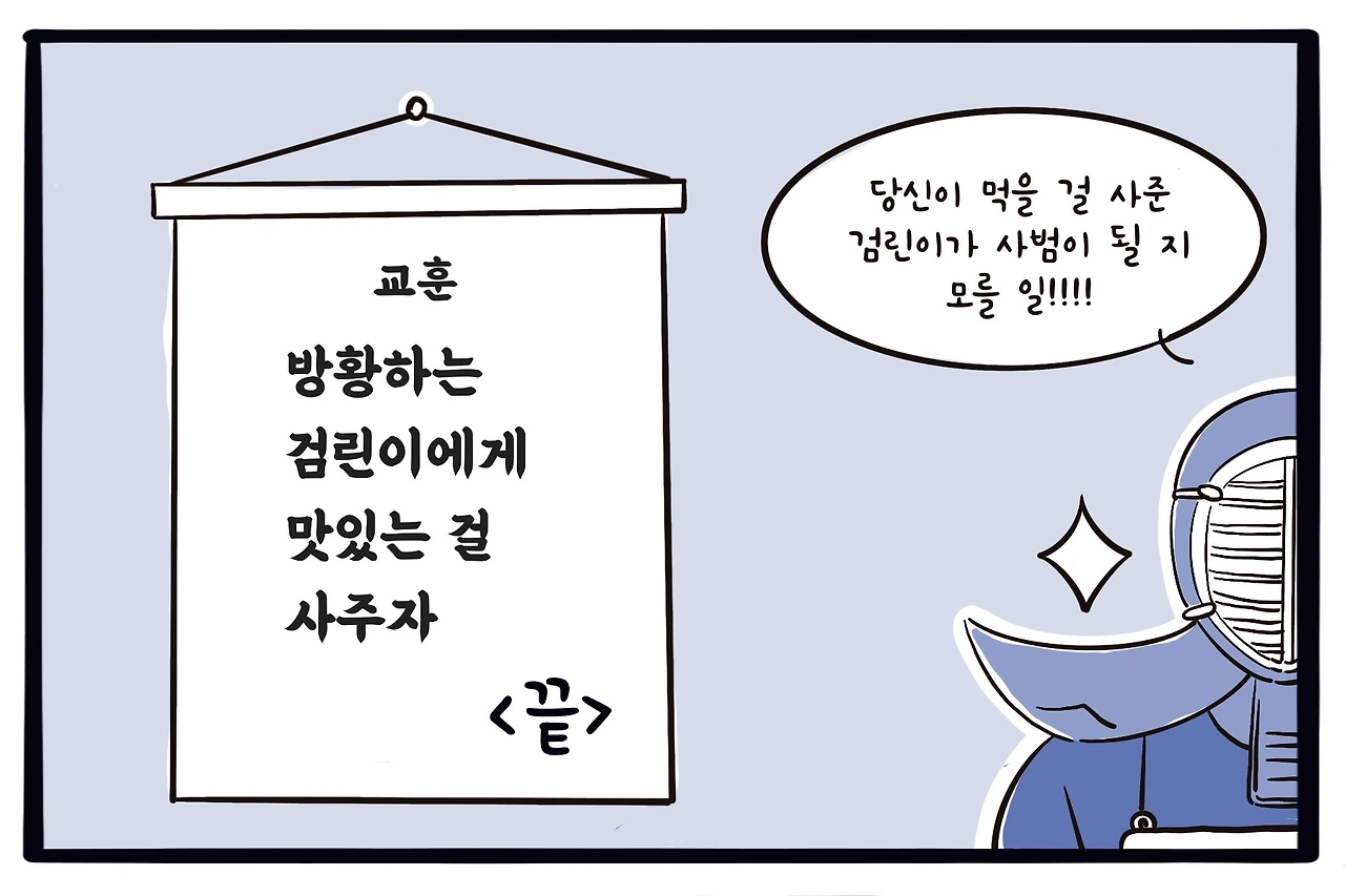 부드러운 하체 동작, 칼을 휘두르는 상체의 움직임, 죽도를 쥔 손의 조작, 상대의 공격을 읽는 눈, 공격의 적기를 파악하고 몸을 던지는 타이밍 등등. “악마는 디테일에 있다”더니 취미생활마저 디테일 없이는 쉬이 즐겁지 않다. 그래도 각각의 기초가 몸에 익은 상태에서 시원하게 성공하는 한방. 그 순간을 제대로 경험했다면 죽도를 쉬이 놓기 어렵다. 이렇게 길게 말해보지만 사실 “누군가를 친다는 것은 그냥 기분이 좋아요"라고 한 외국 펜싱선수의 말이 전부일 지 모른다. 인간의 본성이 꼭 선한 것에만 즐거움을 느끼는 건 아니니까.