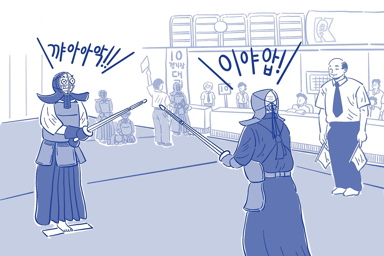 내 시합이 시작됐다. "시작!" 주임 심판의 외침에 “이야아압!" 서로 기합소리를 내며 기선제압을 하는 전초전이 벌어졌다. 나도 있는 힘껏 소리를 내질렀는데, 평소 저음에 가까운 내 기합소리와는 결이 다른 소리가 났다. “꺄아아악!" 육식동물 앞에서 발버둥 치는 초식동물의 울음소리 같은 이 소리. 기합인가 비명인가. 어쩌다 내 입에서 이런 괴성이 나왔는지.