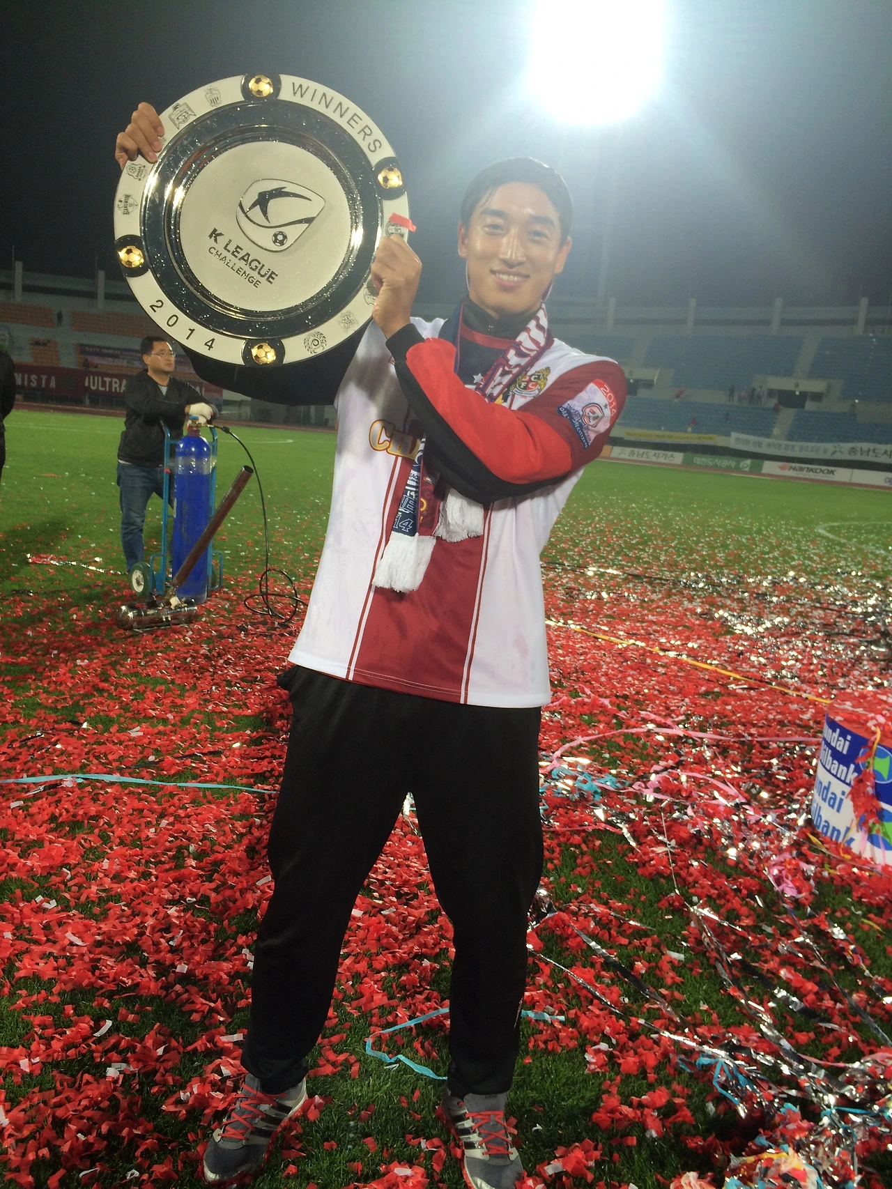 2014년 시즌은 대전시티즌이 엄청난 퍼포먼스로 조기 우승을 거머 줬다. 엉겁결에 K-리그 2 우승컵을 들어 올리는 행운을 경험하게 된다. 그리고 나의 꿈을 이루는 순간도 맞이 하게 된다. 리그 마지막 경기가 안산 무궁화 FC 원정경기였다. 이미 우승을 확정했기에 주전 선수들에게 휴식을 주고 후보선수들에게 기회를 줬다. 그 경기에는 데뷔전을 치르는 선수가 나와 다른 선수 한 명을 포함해서 두 명이었다. 나머지 선수들도 대부분 10경기 이하로 뛴 선수들이었다.
