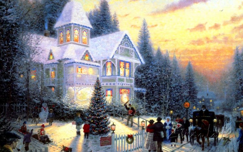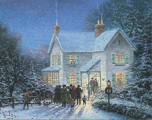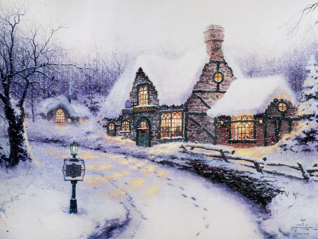 크리스마스 분위기가 물씬 나는 그림들입니다. 깊이 생각할 필요도 없는 그저 마구 다가오는 그림입니다. 아마 작가도 그다지 깊은 생각을 하며 그림을 그렸을 것 같지는 않아요. 아름답고 따뜻한 크리스마스면 되지 뭘 더 바래, 하며 그렸을 것 같습니다. 집 주변으로는 숲이 가득해 잎진 낙엽송도 있을 것이고 그보다 늘 푸른 나무들이 그득한 곳입니다. 숲에는 하염없이 고요하게 눈이 내리고 집 앞에도 흰 눈이 가득 쌓여있습니다. 창문마다 크리스마스 장식과 촛불이 어여쁘게 자리를 잡고 온 집의 등은 환하게 켜져서 지나가는 사람들의 마음조차 따뜻하게 해 줄 그런 집입니다. 털모자와 털장갑을 낀 아이 하나가 부모의 손을 잡고 팔짝 거리며 돌 위 계단을 걸어가며 할머니 할아버지를 부르는 장면이 저절로 연상됩니다. 저 따뜻한 집 문을 열고 반갑게 손녀딸을 맞아들이는 할아버지와 할머니가 보이는 듯도 합니다. 바로 옆의 그림 역시 킨케이드가 그린 새벽송 풍경입니다. 어렸을 때 새벽송 하는 분들을 위해 엄마는 따뜻한 죽이나 식혜를 준비하셨는데 작은 잔치 같은 분위기 때문에 안 자려고 눈을 부릅뜨고 있다가 아스라한 꿈속에서 기쁘다 구주 오셨네~가 들려오곤 했어요. 그 아름다운 풍경이 사라져 버리고 이제는 그림이나 기억 속에서 존재하게 되었습니다. 문득 새벽송이 빠져나간 헐거워진 틈새로 세상의 것들이 물밀 듯 밀려들어오지 않았을까.... 자세히 보면 그림 속 굴뚝들에서 연기가 피어오르고 있습니다. 얼마나 따뜻해 보이는지.... 굴뚝 연기는 그리 따듯해 보이기도 하지만 사람이 살고 있다는 표식이기도 하죠. 오늘 아침 우리 동네는 영하 13을 찍었어요. 차를 운전하는데 제가 숨을 쉴 때마다 김이 나오는 거예요. 굴뚝의 연기처럼 살아 있는 표식이기도 하지만 그만큼은 따뜻해야 되지 않겠니.... 토마스 킨케이드는 가난해서 집을 내놓아야만 하는 입장에 처했을 때 집을 구할 돈을 구하기 위해 그림을 팔러 다니지만 팔지는 못하고 대신 ‘사랑하는 사람을 위해 그림을 그리라’는 글랜의 충고를 받아서 가장 아름다운 집을 그려 어머니에게 드리게 되죠. 결국 미국인들이 가장 사랑하는 빛의 화가, 크리스마스 화가가 되었죠. 미국 가정에 그의 작품이 적어도 천만 개는 있을 거라는 이야기도 있어요. 그의 작품에 대해 클래식한 평론가들은 난리를 해댔죠. 그는 의연하게 대답했어요. <문화와 상관이 없을지 몰라도 내 예술은 천만의 사람들과 관련이 있기 때문에 의의가 있다. 나는 실제 사람들과 관련이 있다. 세상에 추함만 있는 것이 아니란 것을 사람들에게 일깨워 준다. 나는 수많은 사람에게 그들이 이해할 수 있는 예술을 가져다준다> 킨케이드는 아내를 지극히 사랑해서 그의 작품 속에 내 니트(NANETTE)의 이니셜인 ‘N’을 넣곤 했습니다. 물론 이 두 작품에도 있습니다. ‘당신의 삶을 빛나는 명작으로 만드는 7일간의 동행’이란 그가 그리고 쓴 아주 어여쁜 책이 있는데 <나는 최선을 다해 그림을 그리면서 하나님과 하나 되기를 간절히 소망한다>는 고백을 만나게 됩니다.