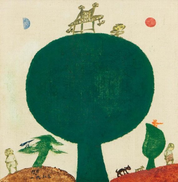 장욱진의 나무 역시 이름이 필요 없다. 나무라고 하기에는 너무 가볍고 또 너무 크다. 집을 품고 있는 나무이며 산보다 더 큰 나무이며 무엇보다 그의 나무는 땅에 심어져 있지 않다. 공간에서 호흡하는 나무라고나 할까, 그래선지 금방이라도 날개 짓을 하며 솟아오를 것 같기도 하다. 어느 나무는 누워있기도 하고 길게 기울어져 마치 세상을 품에 안고 잠든 것처럼도 보인다. 거대한 숲처럼 보이기도 하는데 실제 그의 나무에는 사람이 살기도 한다. 새가 깃들여 노래하고 강아지의 쉼터가 되는 나무. 어느 나무는 하도 거대해 숲과 산을 지나 세상에, 나무 안에 달과 해가 깃들기도 한다.