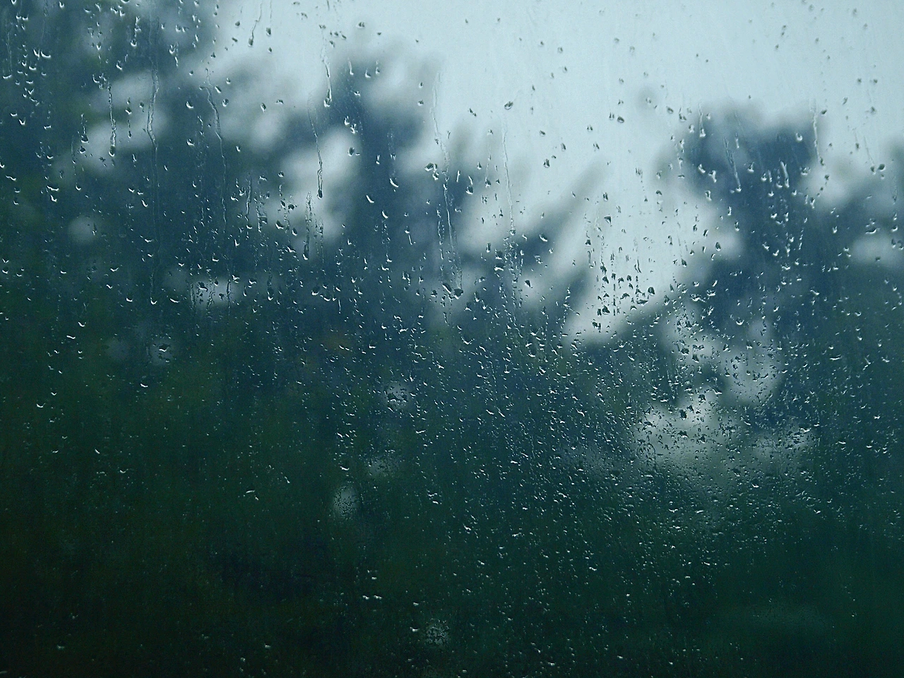 비 내리는 아침, 거실 창문에 빗방울이 부딪히고 자그마한 나뭇잎들에
