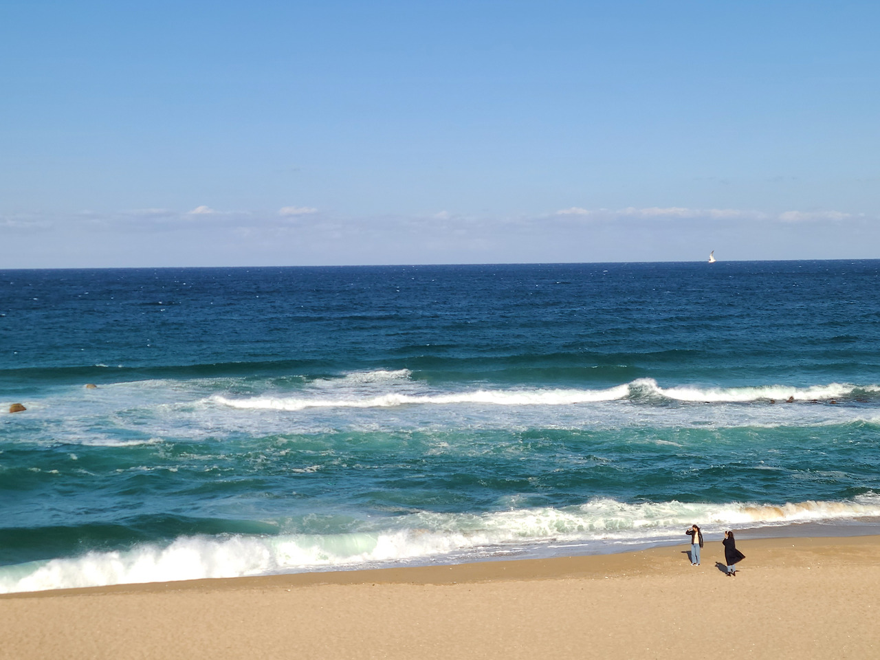 바닷가 카페에서 바라본 짙푸르고 맑은 동해물은 조금 세찬 바람에