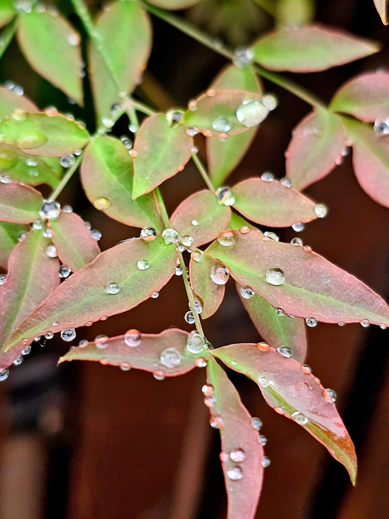 잠시 흩뿌린 빗방울을 담고 있는 남천 나뭇잎에