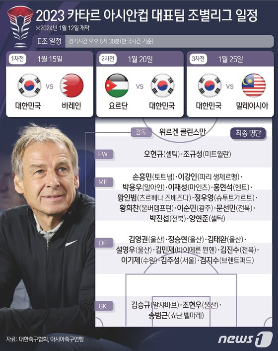 FIFA 랭킹 23위인 한국 대표팀은 이번 아시안컵 조별리그 E조에서 바레인, 요르단, 말레이시아와 경쟁한다. 이들과의 역대 전적 및 FIFA 랭킹을 고려했을 때, 한국은 명백한 E조 최강 전력을 갖추고 있다고 할 수 있다.