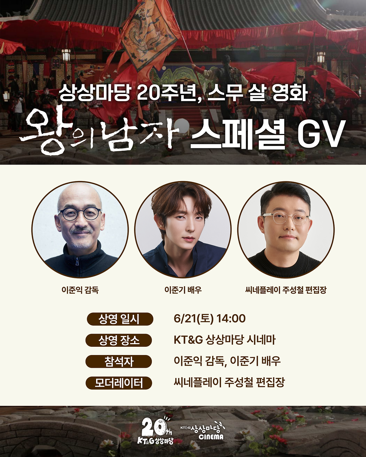 [상상마당 20주년, 스무 살 영화] 특별 상영 및 스페셜 GV는 상상마당 20주년을 기념하여 상상마당과 같은 해에 태어난 ‘스무 살 영화’를 다시 극장에서 만나보는 자리를 만들고자 기획되었다. KT&G 상상마당 시네마는 지난 5월 12일부터 18일까지 공식 인스타그램을 통해 ‘2005년 개봉한 한국 영화 중 보고 싶은 작품’을 주제로 관객 투표를 받아 다수의 추천을 받은 <왕의 남자>가 최종 상영작으로 선정되었다.