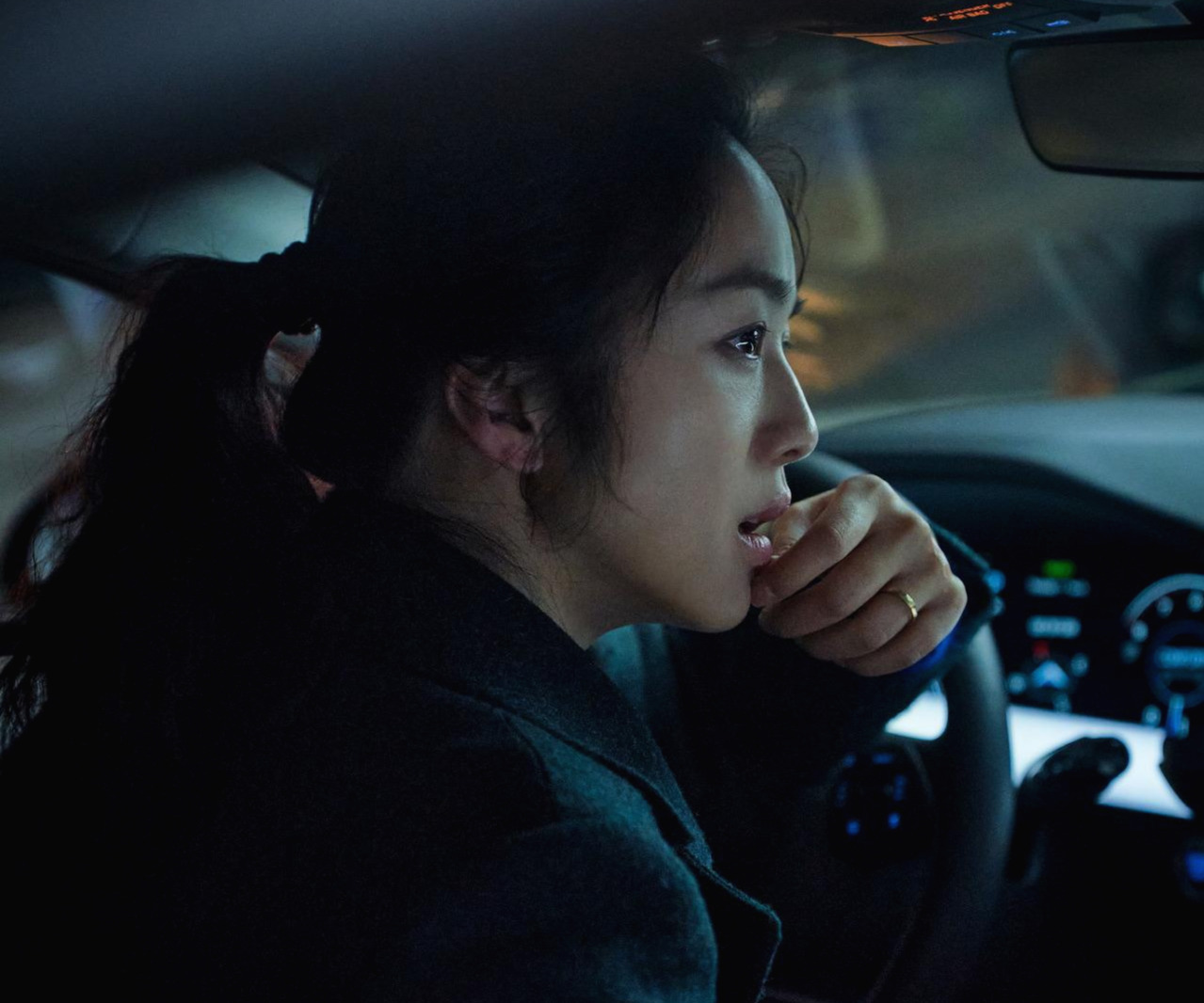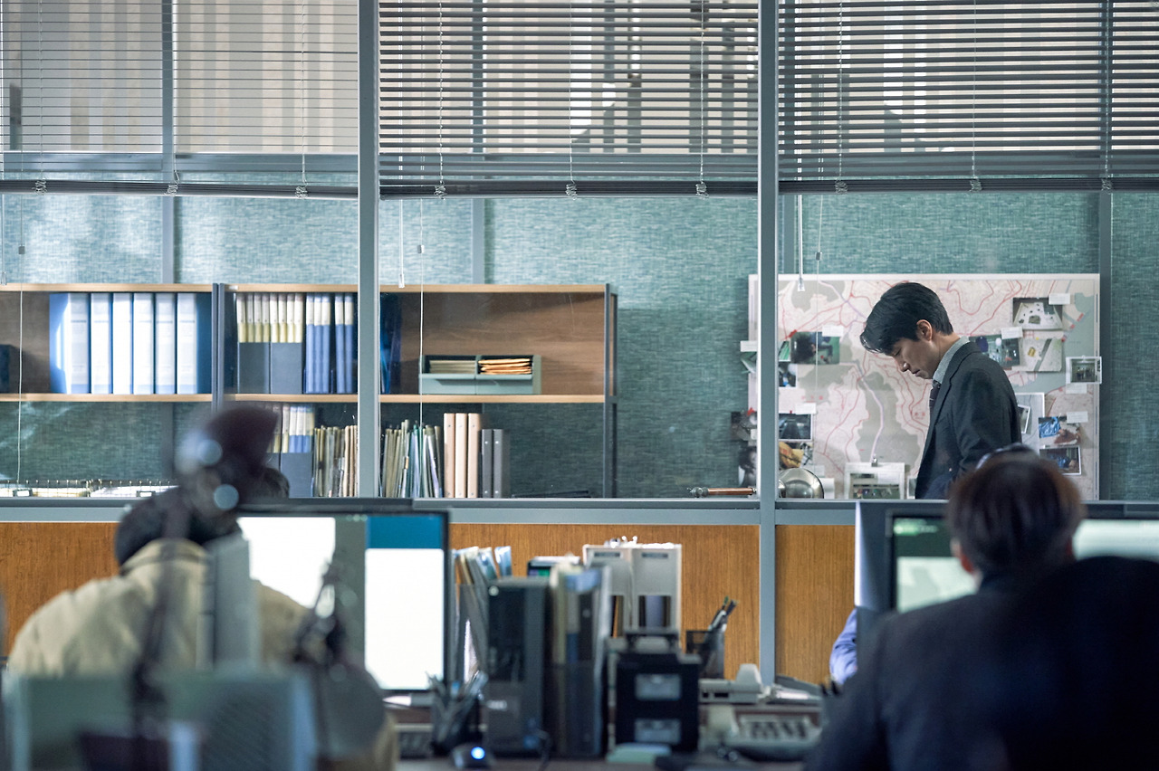 의심은 짙어지고, 해준의 시선도 노골적으로 바뀐다. 서래를 용의 선상에 두고 집 근처에서 잠복근무를 하며 응시한다. 잠복근무는 대상을 사건의 진실을 밝히고자 끊임없이 지켜본다는 점에서 관음과도 맞닿아있다. 망원경으로 서래의 집을 올려다보는 해준의 행위에서 히치콕의 문양이 느껴진다. 특히 <이창>(1957)의 제프(제임스 스튜어트)가 창문을 통해 주변 이웃들을 훔쳐보는 과정과 꽤나 닮아있다. 관음을 하는 시선은 구체적인 형상이 되어 공간을 뛰어넘으며 서래와 해준이 투 숏으로 함께 존재하게 된다. 이는 서래에게도 적용된다. 서래는 취조실에서 나온 후, 자동차로 해준을 따라간다.(궁금증에서 비롯된 행위였을 것이다.) 이때 해준은 다른 사건의 용의자와 옥상에서 대립하는데 자동차 안에서 지켜보는 서래와 해준은 눈이 마주치며 시선은 전복된다.