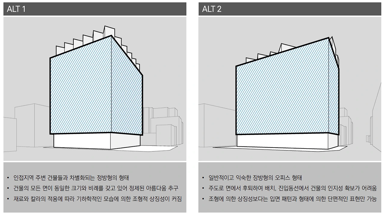 정방형(좌)과 장방형(우)의 매스 대안 *간삼건축 제공