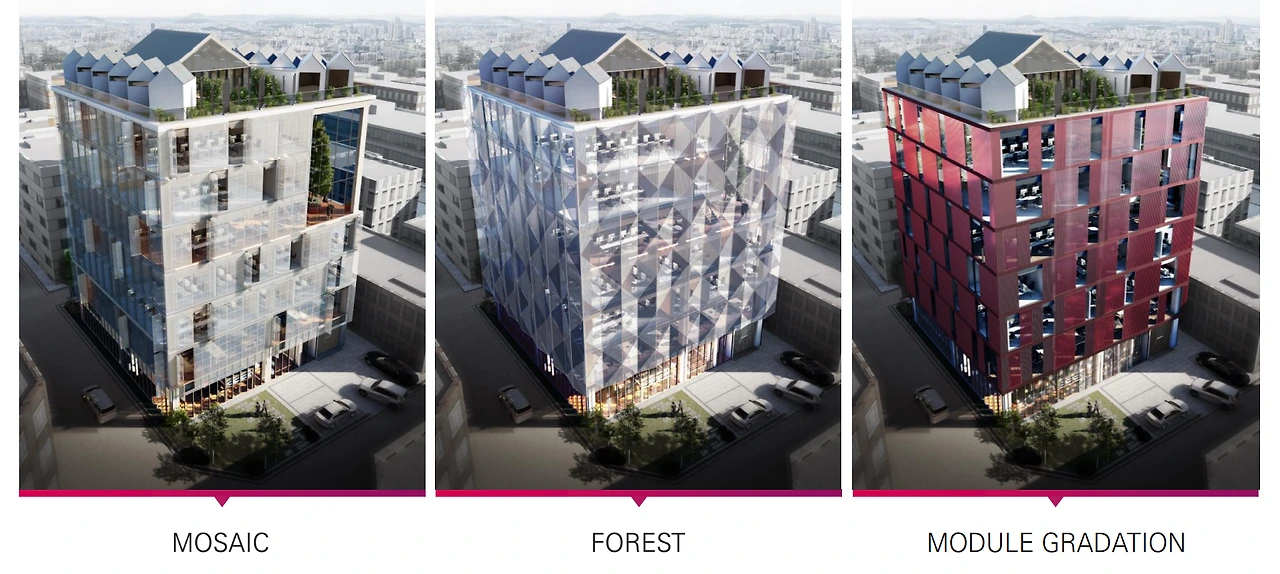 첫 번째 디자인 ‘MOSAIC’는 펀칭메탈이라고 하는 구멍이 난 금속 패널을 유리 바깥으로 이중 설치를 하고요. 날씨에 따라서 창문을 닫았다가 열었다 할 수 있게 기능을 구현한 디자인입니다. 누군가는 해가 들어오는 게 싫을 수 있고, 누군가는 창문을 열고 바깥을 보는 걸 좋아할 텐데 그런 개개인의 성향에 따라 창문의 열고 닫히는 위치가 매일 달라지는 거예요. 정육면체 형태의 단순함이 있지만, 그러한 행위에 따라 모습이 달라질 거라는 생각에 첫 번째 디자인이 나온 거고요. 두 번째 디자인 ‘FOREST’는 유리를 크리스탈 커팅으로 엣지가 있게 붙일 생각이었어요. 유리의 각도에 따라 햇빛이 다르게 들어오기 때문에, 보석 같은 느낌으로 보일 거라는 기대가 있는 디자인이었어요. 마지막 세 번째 디자인 ‘MODULE GRADATION’이 최종 선정된 디자인입니다. 제가 디자인했던 거라 더 애착이 가네요. (웃음)