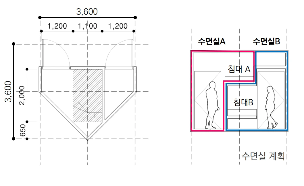 리프레쉬룸을 잘 보시면 벽이 ‘ㄱ’ 자로 꺾여있습니다. 한쪽 방의 문을 열면 침대가 아래에 있고, 반대쪽 방은 사다리를 타고 침대로 올라가는 구조로 벽이 나뉘어 있는 겁니다. 방의 크기를 키우지 않고, 2층 침대를 만들지 않고도 각자 다른 방에서 쉴 수 있는 공간이 되는 거예요. 1인 샤워실도 마찬가지입니다. 서로 벗은 모습을 보는 게 민망할 수 있잖아요. 오롯이 혼자 샤워를 하면서 기분 전환하길 바랐습니다. ‘공유’ 오피스에서 일하지만, 적어도 잠을 자거나 씻는 순간에는 혼자만의 시간을 가졌으면 했어요.