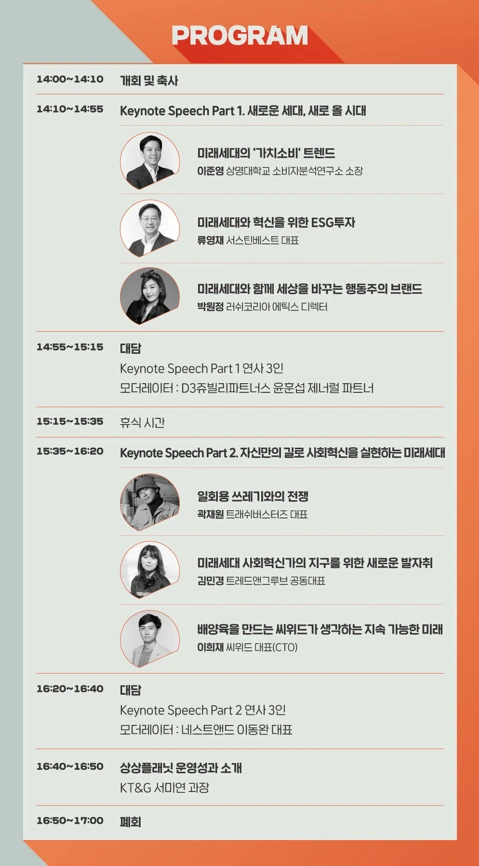 미래세대의 ‘가치소비’ 트렌드와 ESG 투자, 그동안 사회혁신을 만들어 온 브랜드의 사례를 통해 새로 올 시대를 살펴보고, 실제로 사회혁신을 만들어 가는 미래세대의 케이스를 통해 세대기반의 새로운 사회혁신을 확인해 보는 자리로 마련했습니다. 상상플래닛 멤버인 ‘트레드앤그루브’의 김민경 공동대표도 키노트 스피치 연사로 참여해 그동안의 성장과 앞으로의 비전을 공유할 예정이에요.