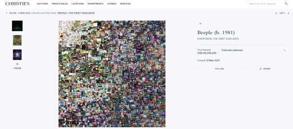 NFT의 가격은 천차만별이에요. 무료부터 시작해 수백억 원에 달하는 NFT도 존재하죠. 대표적인 예로 제프 쿤스, 데이비드 호크니에 이어 가장 높은 작품 판매가를 올린 디지털 아티스트 비플(Beeple)의 <매일: 첫 번째 500일>이라는 작품 NFT는 약 830억 원에 팔리기도 했습니다.