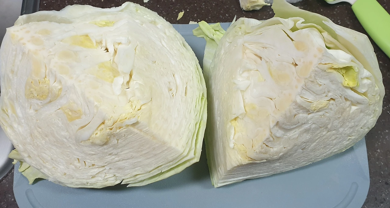 1. 재료 양배추 반토막을 사서, 뿌리 부분을 제거하고, 식초 한 스푼 넣은 물에 담근 후 잘 씻는다.