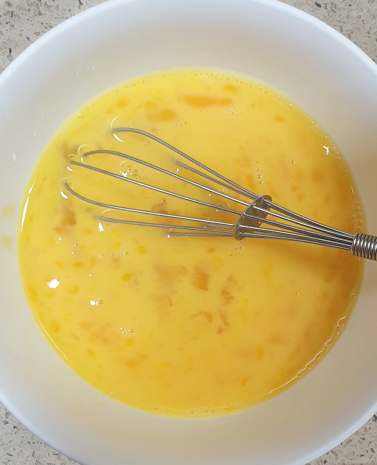 계란 4개를 풀어서 약불에 데운 프라이팬에 붓는다.