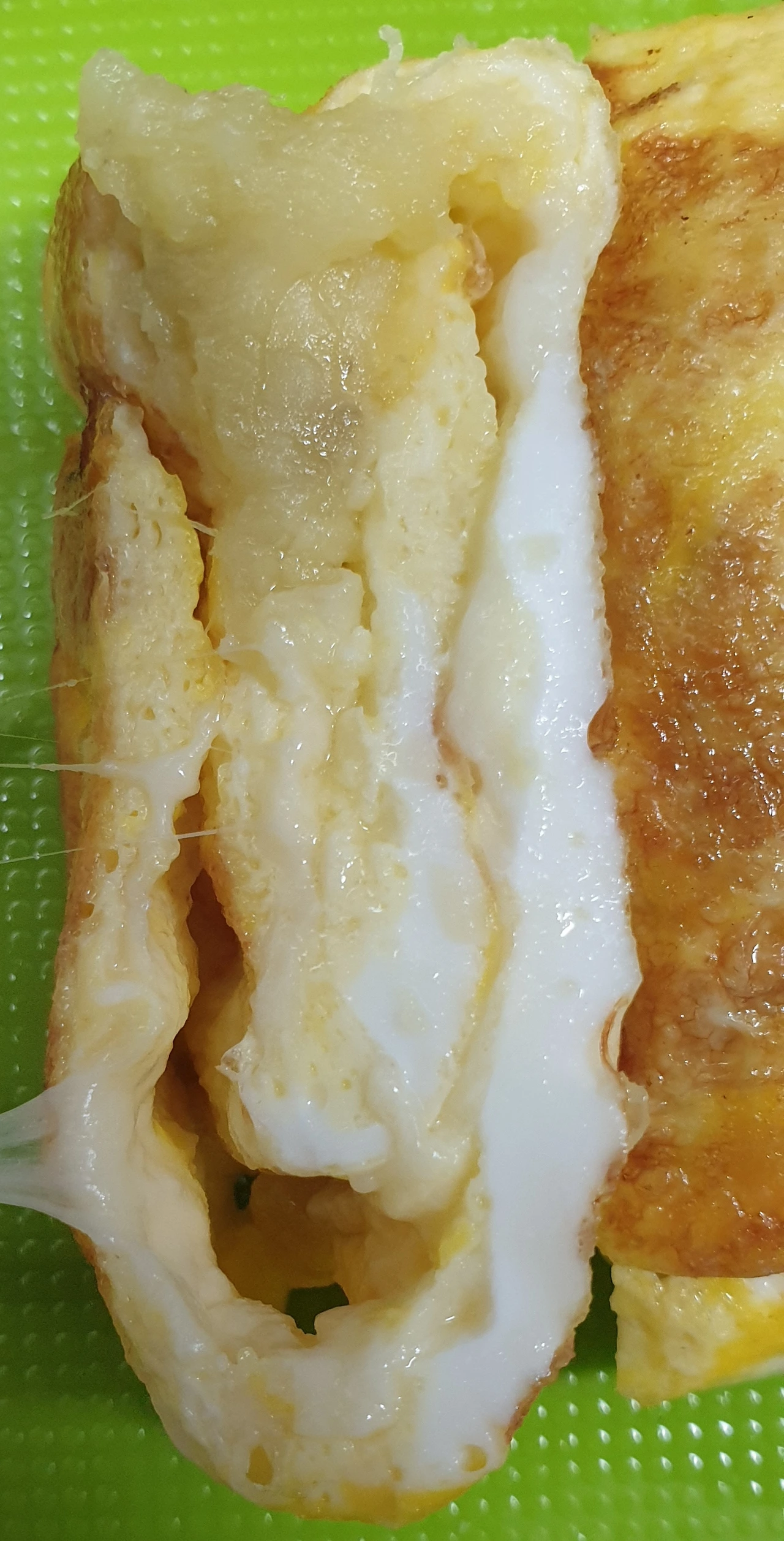 가까스로 뒤집은 고구마 치즈 계란말이. 모짜렐라 치즈 파편과 고구마 파편들. 조리 후기