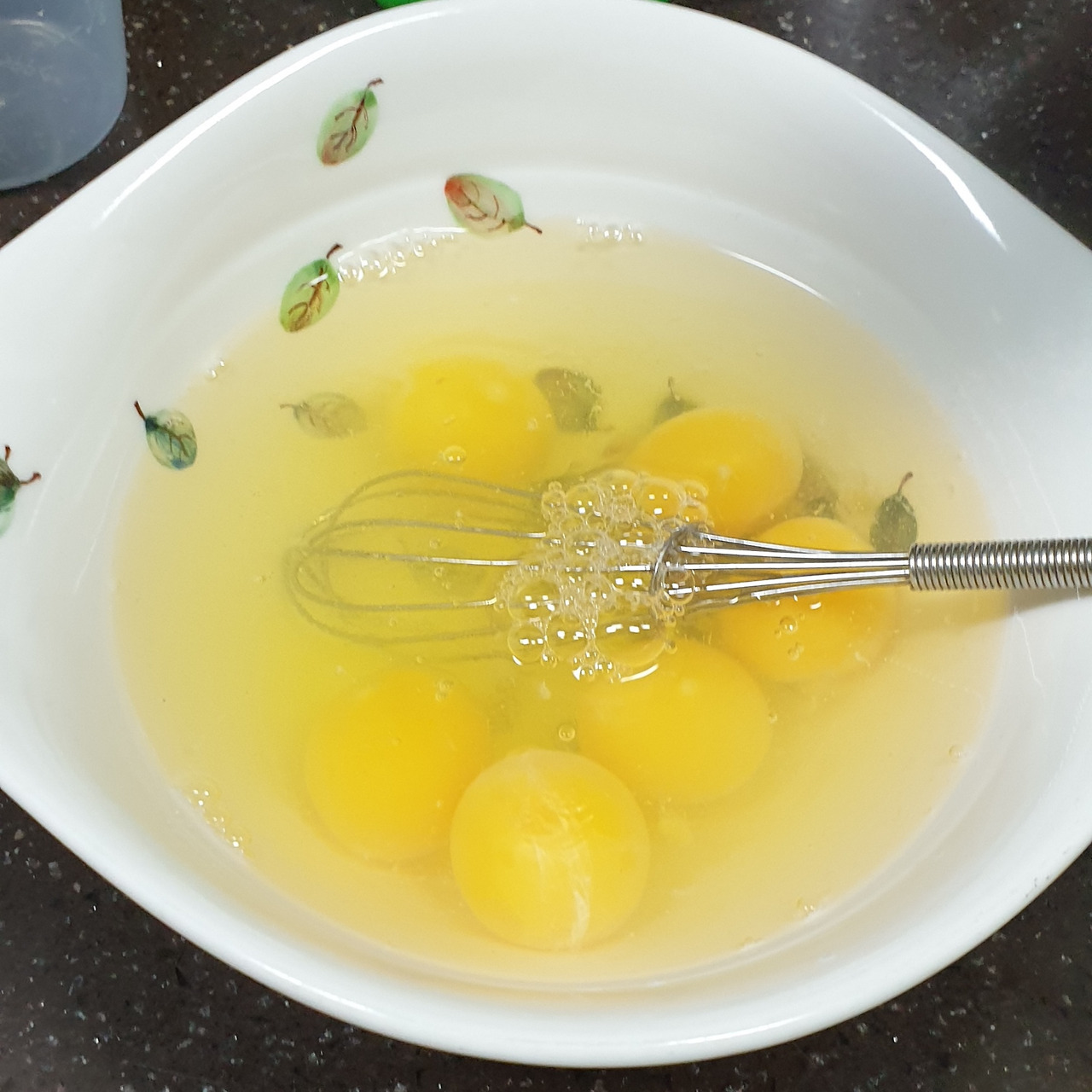 다시마 2장을 준비해서 우려둔다. 다시마 물 120미리 넣고 계란을 푼다. 이때, 채와 젓가락를 이용해서 알끈을 제거한다. 알끈을 제거해두는 것은 거의 모든 레시피마다 공통적으로 강조하는 점인데, 계란을 푸는 과정을 용이하기 위한 과정인 듯하다. 채가 없으면 그냥 더 열심히 저어도 된다.